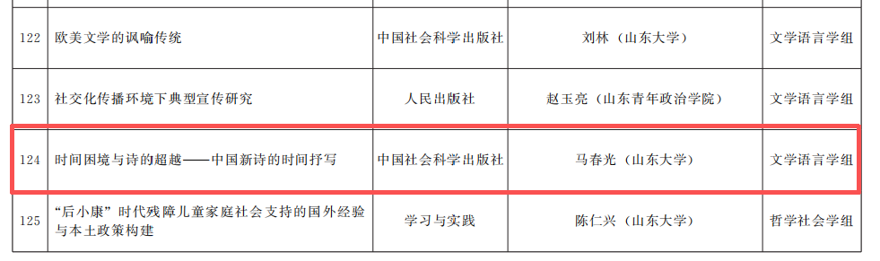 近日,山东省社会科学优秀成果奖评选委员会正式公布了第三十七届社会科学优秀成果奖拟获奖名单,人文艺术研究院黄宏运博士后的论文“Climbing the quality ladder of green innovation: Does green finance matter?” 和马春光副教授的著作《时间困境与诗的超越:中国新诗的时间书写》分别荣获山东省第三十七届社会科学优秀成果奖二等奖、三等奖。