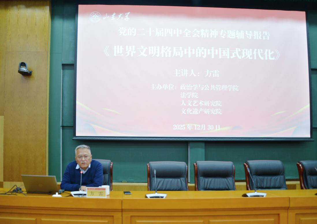为深入学习贯彻党的二十届四中全会精神,进一步凝聚广大师生的思想共识与奋进力量,12月30日下午,人文艺术研究院、政治学与公共管理学院、法学院、文化遗产研究院联合举办党的二十届四中全会精神专题辅导报告会。报告会由山东大学当代社会主义研究所所长、特聘教授方雷主讲,政管学院党委书记李海燕主持报告会。