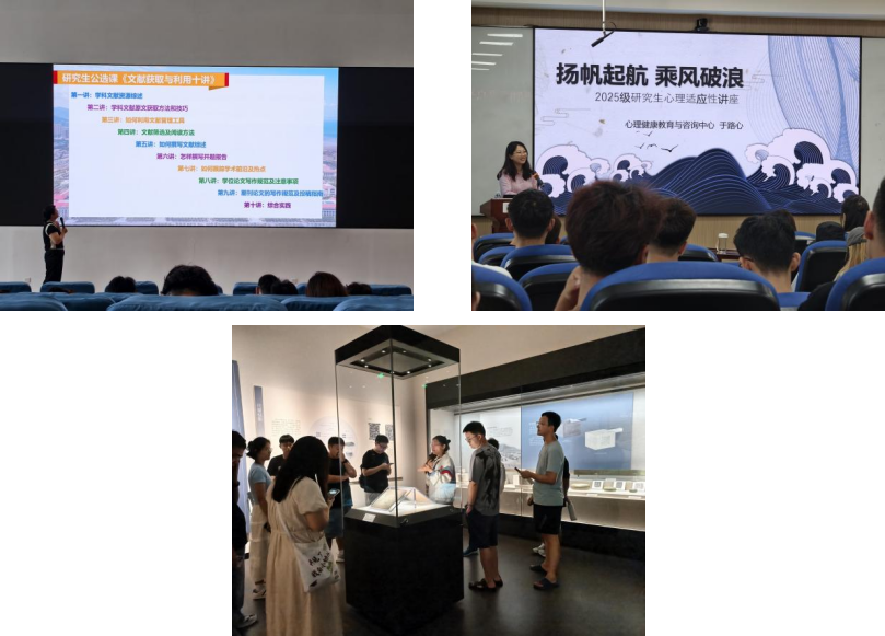促进入学适应,关爱身心健康。9月4日,青岛校区图书馆廖静开展图书馆入馆教育暨数据库应用能力培训,向新生介绍了山东大学图书馆的悠久历史、完备设施、丰富资源和贴心服务,提高了新生利用各类文献资源开展学习和科研的综合能力。9月6日,研究院组织全体新生参观青岛校区博物馆,加深了新生对学校和研究院的情感共鸣和价值认同。9月7日,校区心理健康教育与咨询中心于路心为全体新生带来研究生新生心理适应性讲座,详细介绍在面对环境适应、人际关系、学习适应、情绪管理等方面的应对举措,为新生更好地适应新阶段学习生活提供了有力支持和指导。