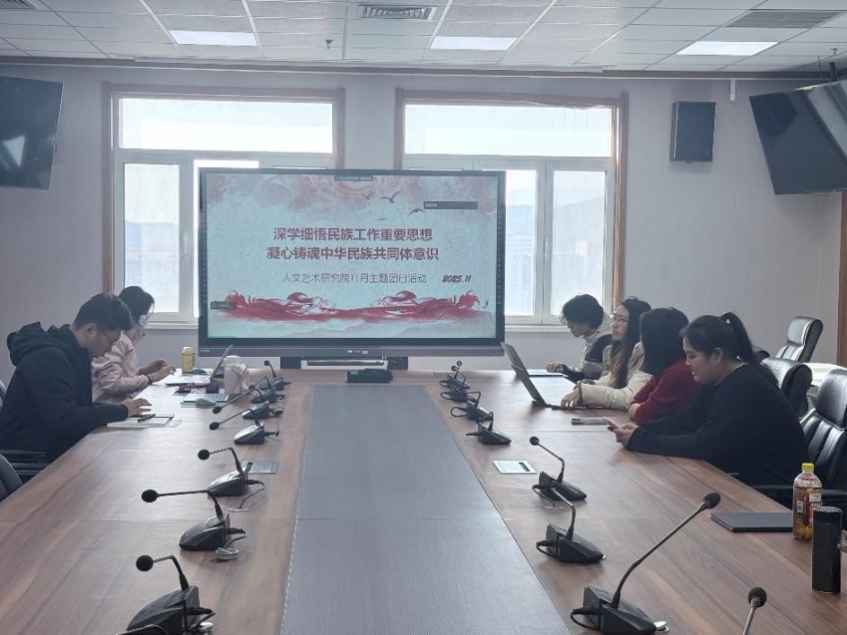 为深入学习贯彻习近平总书记关于加强和改进民族工作的重要思想,铸牢中华民族共同体意识,12月1日,人文艺术研究院在青岛校区图书馆会议室举办“铸牢中华民族共同体意识”主题团日活动,辅导员赵梓涵及全体研究生参加活动,2025级硕士研究生郑宇飞主持活动。
