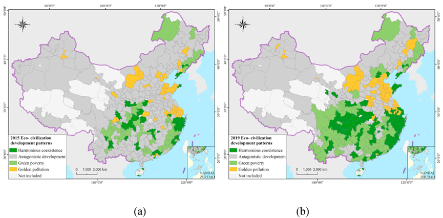 图3.展示了2015年(a)和2019年(b),中国生态文明建设模式的空间分布。