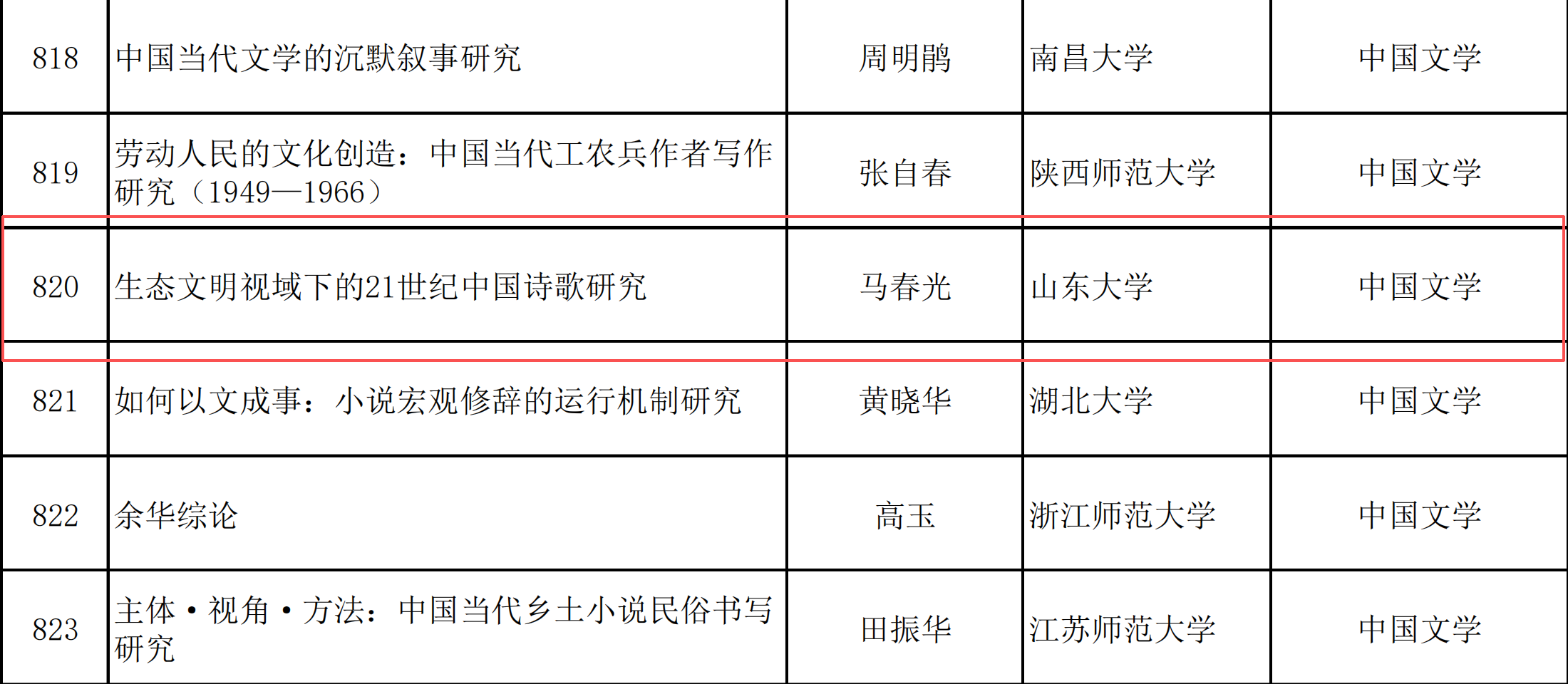 近日,全国哲学社会科学工作办公室公布了2025年度国家社会科学基金后期资助项目立项名单,人文艺术研究院诗学高等研究中心副教授马春光申报的课题《生态文明视域下的21世纪中国诗歌研究》获批立项。