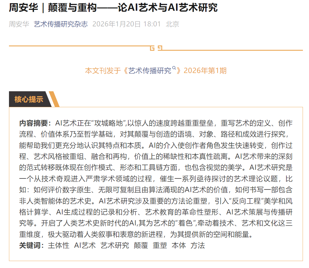 近日,山东大学人文艺术研究院周安华教授在《艺术传播研究》2026年第1期发表题为《颠覆与重构——论AI艺术与AI艺术研究》的学术论文。论文聚焦 AI 艺术的崛起及其对艺术领域的全方位影响,针对AI颠覆传统艺术范式、重塑艺术新形态、拓展艺术研究维度等重要问题展开深入论述,揭示了 AI 艺术开启人类艺术史新时代的底层逻辑、核心挑战与深远意义。