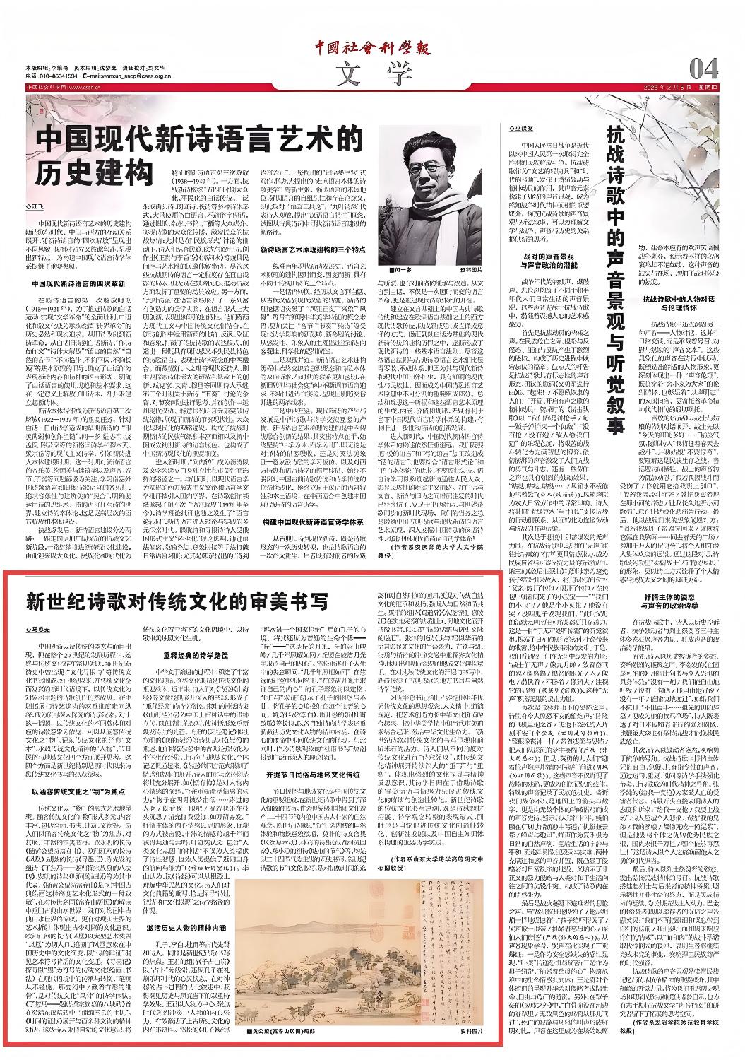 2月5日,人文艺术研究院马春光副教授在《中国社会科学报》文学版发表题为《新世纪诗歌对传统文化的审美书写》的学术文章。