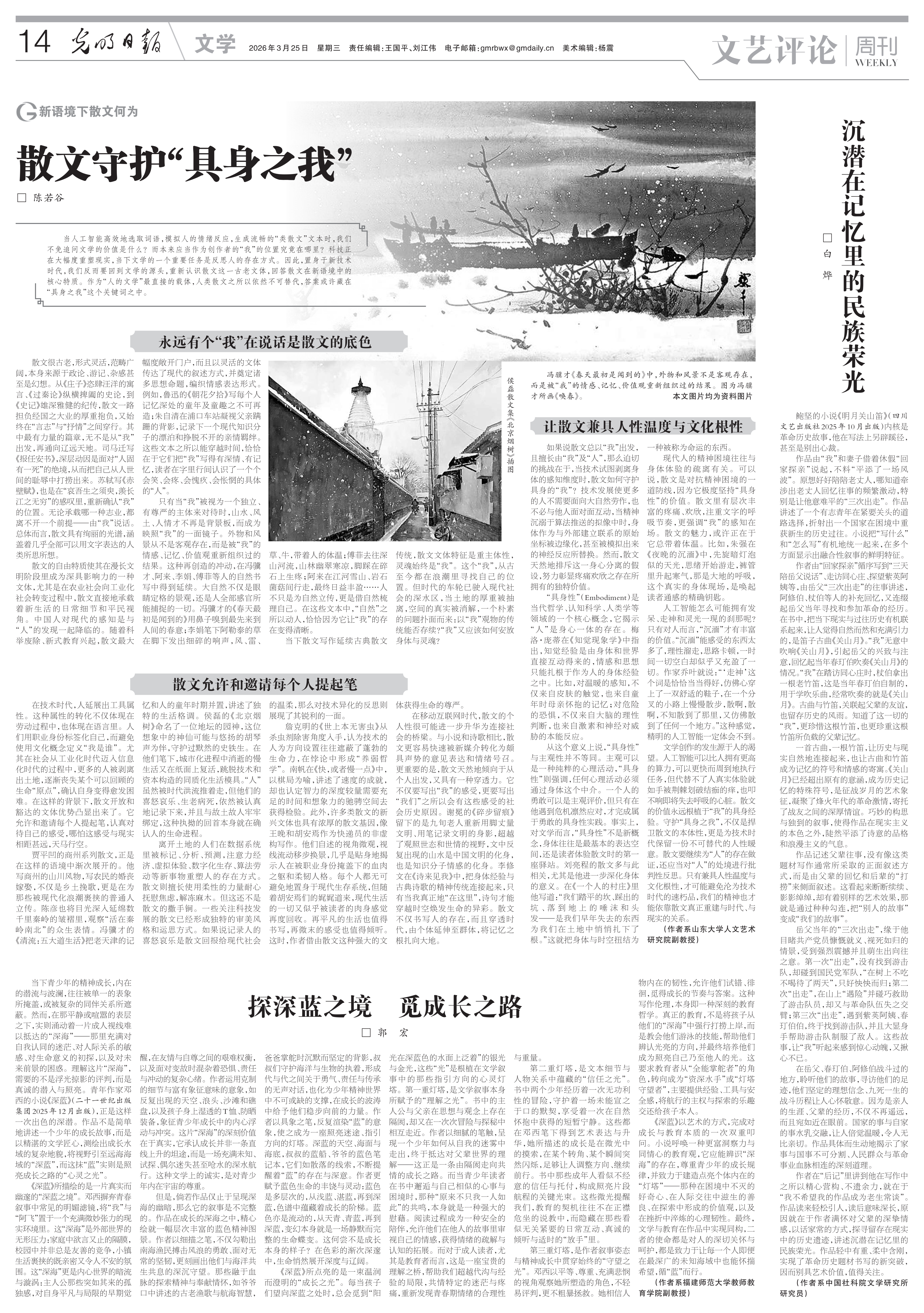 近日,人文艺术研究院陈若谷副教授撰写的理论文章《散文守护“具身之我”》在《光明日报》文艺评论版发表,并获“学习强国”平台全文转载。